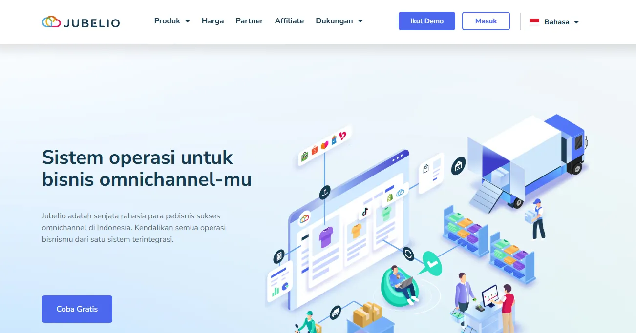 Jubelio merupakan platform omnichannel terkemuka di Indonesia yang dirancang untuk menyatukan berbagai kanal penjualan, baik online maupun offline, ke dalam satu ekosistem yang terintegrasi secara utuh. Masalah utama yang sering dihadapi penjual di banyak marketplace adalah ketidaksinkronan data stok, yang sering kali berujung pada pembatalan pesanan akibat stok fisik yang kosong. Jubelio mengatasi kendala ini dengan memusatkan kendali inventaris; setiap kali terjadi penjualan di satu kanal, stok di seluruh platform lainnya akan terupdate secara otomatis dalam hitungan detik. Selain manajemen stok, platform ini juga mempermudah pemrosesan pesanan massal dan manajemen gudang yang lebih terorganisir bagi para power seller.